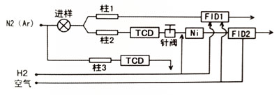 樣品氣通過(guò)一路載氣進(jìn)入FID1檢測(cè)器檢測(cè)出烴類(lèi)氣體,通過(guò)另一路載氣先進(jìn)入TCD檢測(cè)器檢測(cè)H2、O2;然后經(jīng)鎳轉(zhuǎn)化爐,進(jìn)入FID2檢測(cè)器檢測(cè)出CO、CO2,克服大量CO、CO2對(duì)烴類(lèi)氣體,尤其是對(duì)C2H2的檢測(cè)干擾,大大提高了烴類(lèi)氣體的檢測(cè)靈敏度;